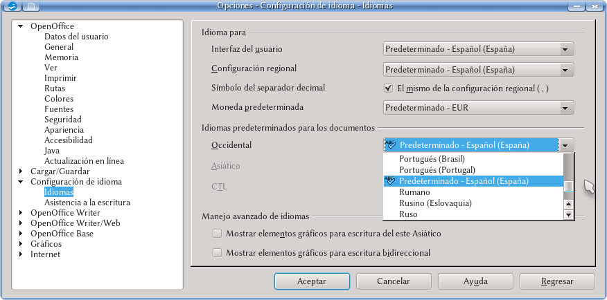 En segundo lugar: ¡Compruebe que el diccionario está instalado! Diríjase a Herramientas → Opciones → Configuración de idiomas → Idioma y revise la lista de «Idiomas predeterminados para los documentos»: si el diccionario está correctamente instalado, verá a la izquierda del nombre del idioma un «ABC✓». Si esta marca no está presente, vea más abajo cómo se instalan los diccionarios.
