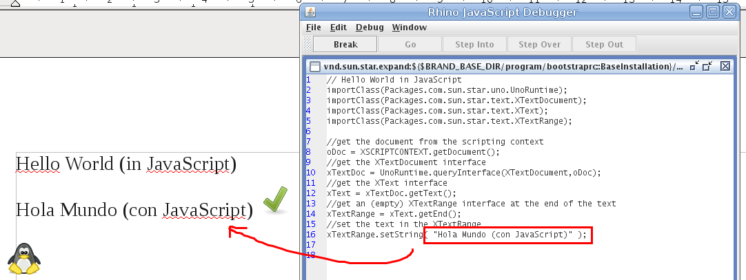 Abre un documento de Writer, ve a Herramientas | Macros | Ejecutar macro... seleccionas Macros de OpenOffice.org | HelloWorld | helloworld.js, después Ejecutar... Para ver su código ve al menú Herramientas | Macros | Organizar macros | JavaScript, seleccionas la macro y le das Editar... Tienes que ver la ventana de depuración JavaScript donde puedes hacer cambios y probar con tu código... El uso de JavaScript es muy similar al uso de Python, en cuanto a estructura: http://wiki.services.openoffice.org/wik ... o/PyUNO_ES