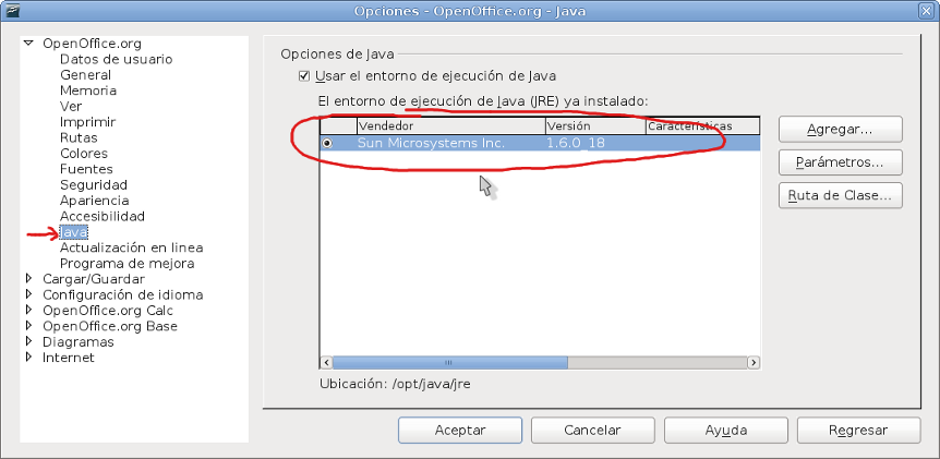 Si ya lo instalaste (JRE) asegúrate de que OpenOffice.org lo esta reconociendo, en el menú Herramientas | Opciones... rama OpenOffice.org subrama Java, como se ve en la siguiente imagen: Si esto responde tu pregunta, por favor edita el primer mensaje de este hilo y agrega al principio del título la etiqueta [RESUELTO], de esta forma conseguiremos un foro más ordenado.