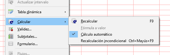 Tengo unas celdas que estan vinculadas a una tabla en la misma hoja y realizo busquedas con la funcion =BuscarV de CAlc, pues me salen sin actualizarse los datos y tengo que pulsar (Ctrl+Shift+F9) para poder actualizarlas, teniendo el calculo automatico activado.