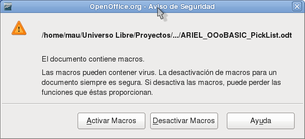¿cuando abres el archivo te muestra un mensaje para activar o desactivar las macros, como la imagen anexa?, si no te aparece, tienes que cambiar tu nivel de seguridad en Herramientas | Opciones | OpenOffice.org -> Seguridad -> Seguridad en macros..., establecelo en Medio. Cierra y todo y vuelve a probar.