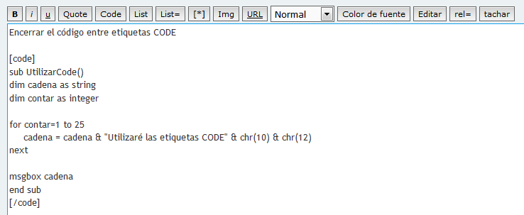 Cómo se utilizan las etiquetas [code] para encerrar código de macros y que los mensajes sean más legibles.