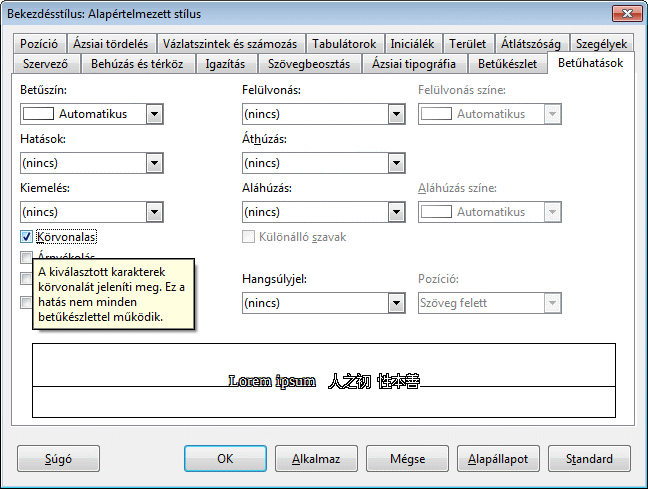 De hát van most is. "Betűhatások"-nak hívják a csoportot, és mind a kézi formázásoknál (karakterek, vagy bekezdések formázása), mind pedig a Stílusoknál elérhető a funkció. A Körvonal jelölőnégyzetet kell bejelölnöd a kiválasztott Stílushoz vagy szövegrészhez.