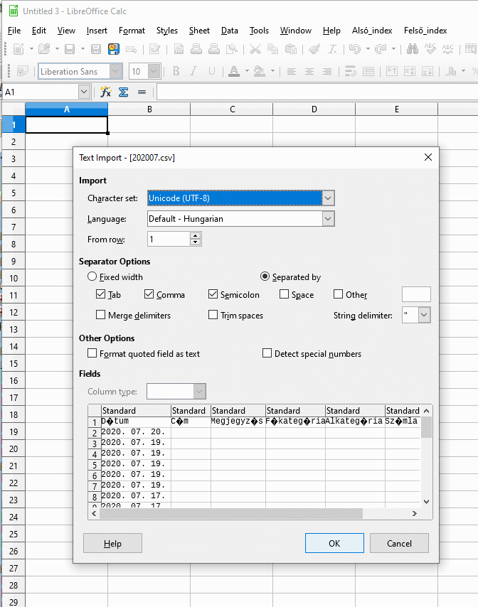 Importáld a Calc-ba (nyisd meg) a .csv fájlból az adatokat Eastern Europe (ISO-8859-2) kódolással ( próbálkozás eredménye, ezzel néz ki a legjobban a .csv fájlod):