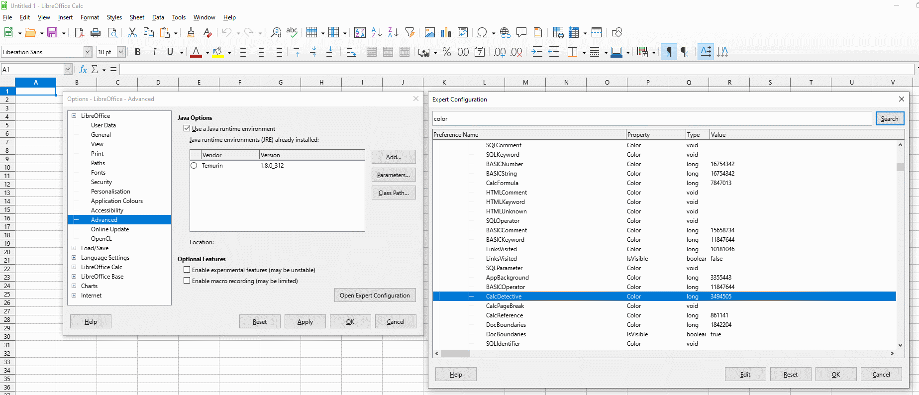 Hosszabban: az általános beállítási lehetőségek között nem látom. De létezik a részletes beállítások lista (egyfajta LO-on belüli Registry). Ebben lehet keresgélni. Például, ha a Color szóra keresek rá, akkor kilistázza az összes Registry-bejegyzést, ami valamilyen színbeállításra vonatkozik. Ahol nagy egész számokat látsz tulajdonságértéknél, azok az R-G-B színkombinációk decimálisra átváltott értékei.