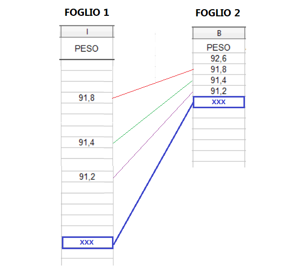 - in una cella del FOGLIO 2 colonna B ( la cella dovrà essere la prima cella vuota/libera in successione verticale alle celle con valore ).