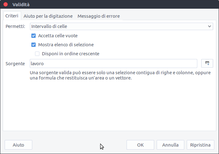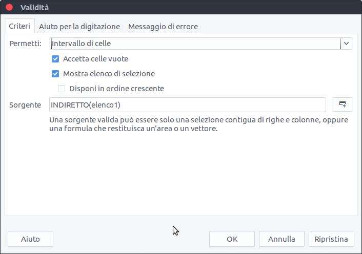 in effetti adesso funziona. In openoffice non trovo indici -> nomi ma con ctrl F3 vado in definisci area per cui penso sia la stessa cosa.