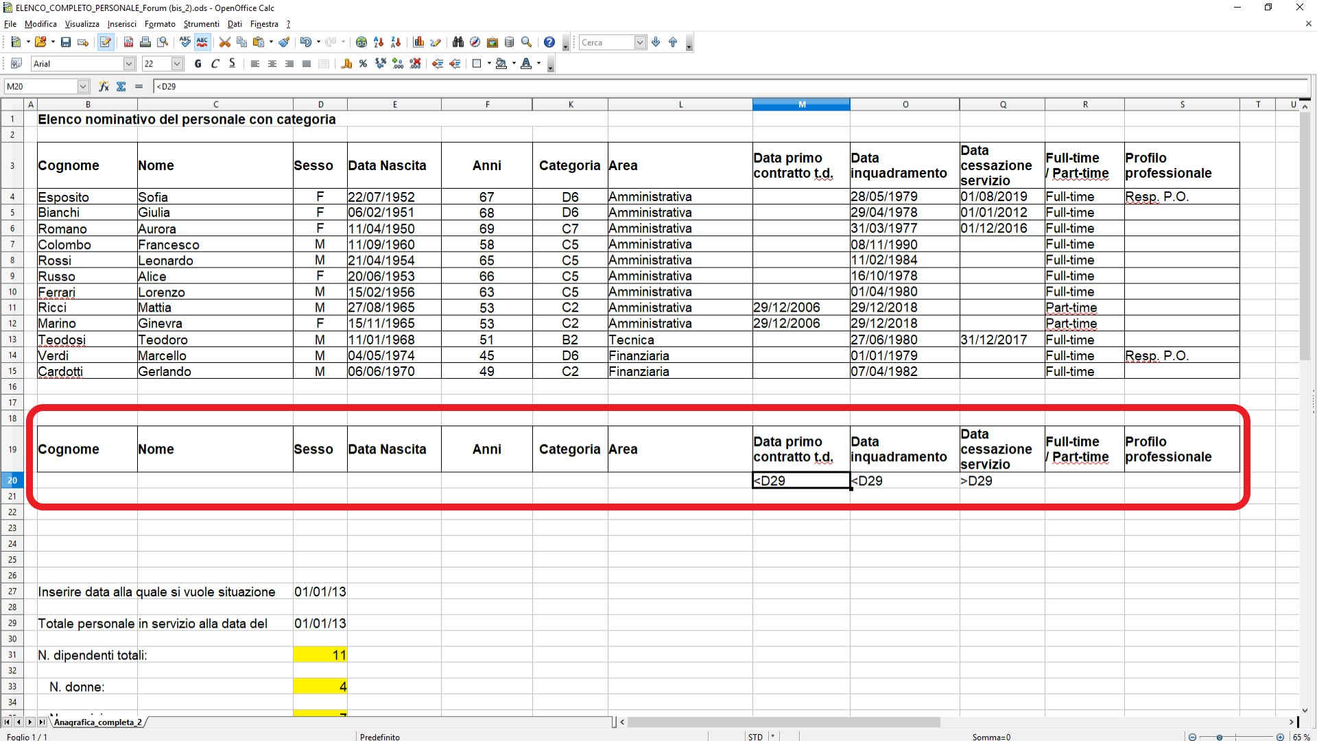 - maggiore del valore in colonna M con titolo "Data primo contratto a t.d." (posto che qualcuno degli impiegati, prima di essere stato assunto a tempo indeterminato, era titolare di contratto a tempo determinato, ma era da considerarsi comunque in servizio); la colonna M può anche contenere celle vuote in quanto il personale può essere stato assunto subito con contratto a tempo indeterminato (