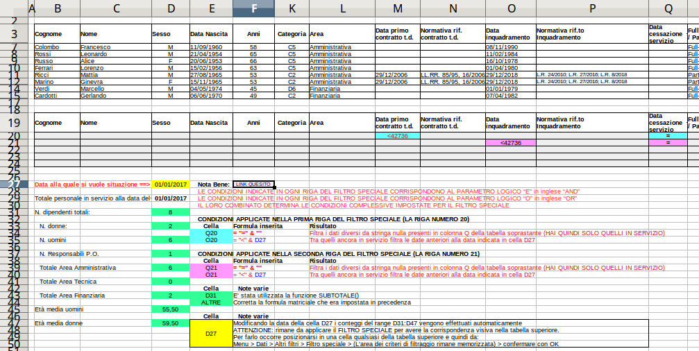 Ho aggiunto una colonna in cui vengono effettuati i riscontri relativi alla data di riferimento e che poi possono essere filtrati.pinimbe ha scritto:per essere conteggiato e visualizzato, il dipendente, alla data di rilevazione, deve essere già titolare di contratto (con tutte le verifiche del caso su "Data primo contratto t.d." e "Data inquadramento" ) e non ancora cessato (con le conseguenti verifiche sulla colonna "Data cessazione servizio")
