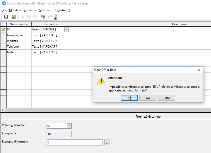Ma quando cerco di salvare mi dice "Impossibile cambiare la colonna ID. Preferite eliminare la colonna e applicare un nuovo formato?".