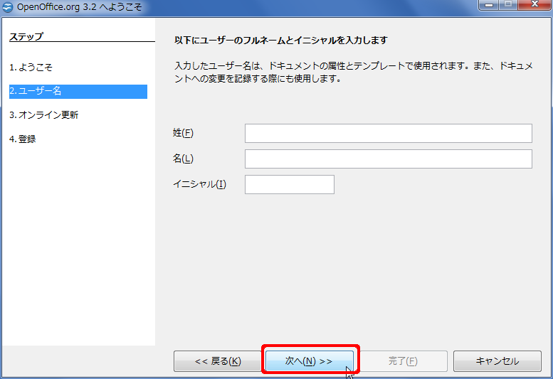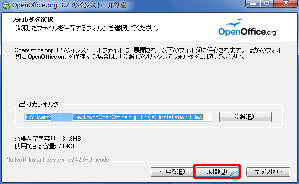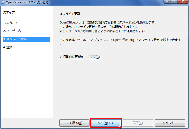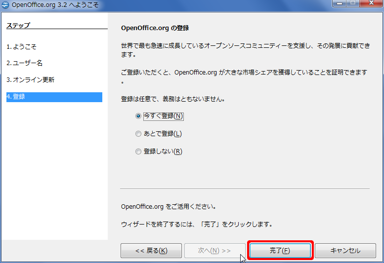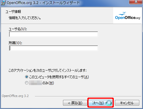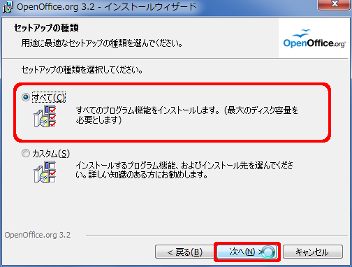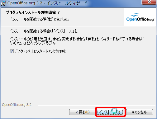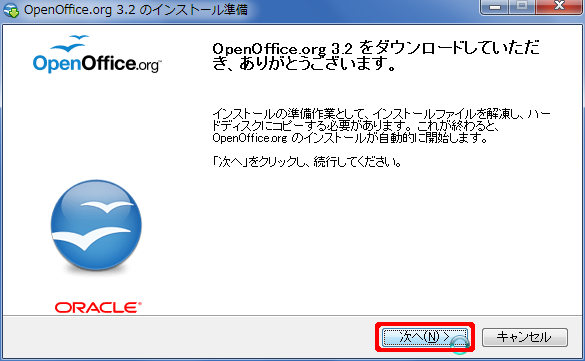 - ダウンロードしたプログラムを実行して OpenOffice.org をインストール