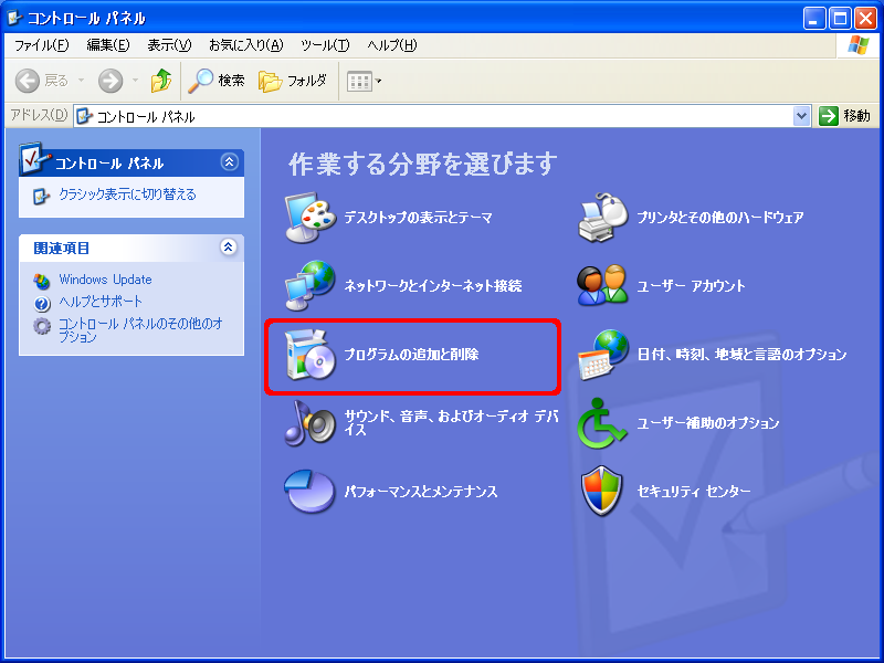 2. コントロールパネルから「プログラムの追加と削除」をクリックします。