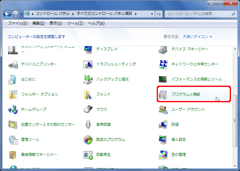 2. コントロールパネルから「プログラムと機能」をクリックします。または、「プログラムのアンインストール」をクリックします。