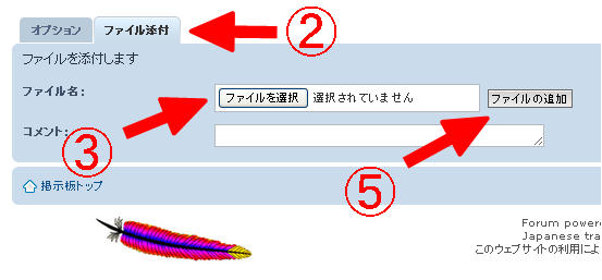 2.トピック投稿ページ下部にある[ファイル添付]タブを開きます。