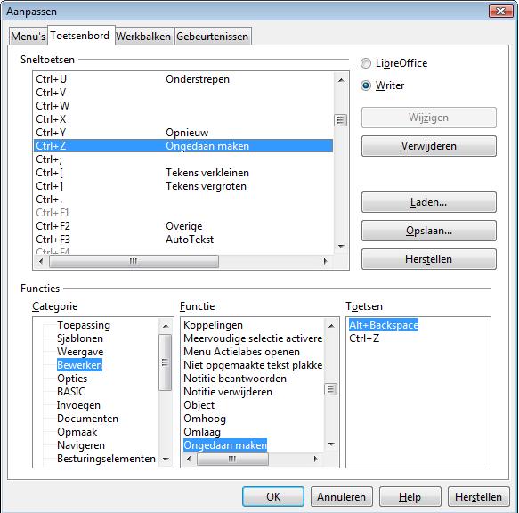 B) Bij mij werkte het volgende: Kies in het vak Categorie: Bewerken; in het vak Functie: Ongedaan maken, in het vak Sneltoetsen: Ctrl+Z, dan klikken op Wijzigen.