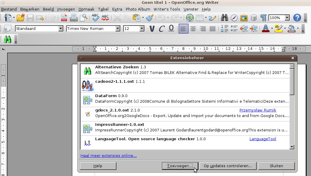 Een OXT-bestand is een OpenOffice.org-extensie(extensie=uitbreiding), die als je in bijvoorbeeld Writer(kan evengoed Calc ofzo zijn), gaat naar: Extra > Extensiebeheer > Toevoegen ... en dan dat oxt-bestand(in jouw geval met OOo-versie 3.2 is dat DisableFirstStartWzd_ooo32.oxt ) daar copy/pasten of aanduiden in Bestandsnaam ...en de rest duid zichzelf aan denk ik ...Moemoes schreef:Ten eerste, wat is een extensie in dit geval, en hoe link je die dan?