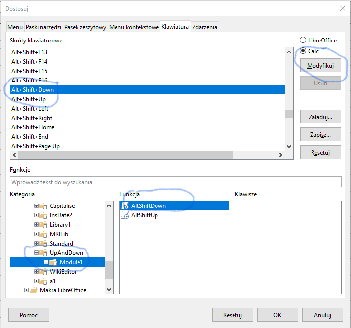 Sprawa wydała mi się ciekawa i być może interesująca także innych użytkowników programu Calc, więc napisałem odpowiednie makro. Właściwie to dwa makra: jedno zamieniające wskazany wiersz arkusza z tym wierszem, który leży powyżej i drugie - zamieniające wskazany wiersz z wierszem leżącym poniżej. Makra nazwałem odpowiednio AltShiftUp i AltShiftDown. Nazwy nawiązują do nieobsadzonych w Calcu skrótów klawiaturowych, które przypisane do odpowiedniego makra będą realizowały jego funkcje (użytkownik może oczywiście utworzyć własne skróty klawiaturowe).